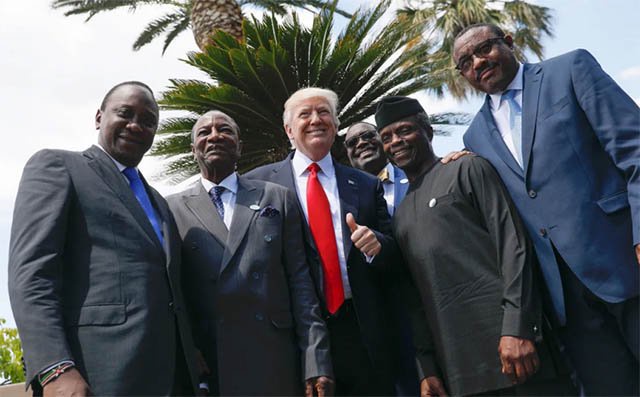 Trump meeting African leaders in 2017. (Left to right) then-Kenyan President Uhuru Kenyatta, then-President of Guinea Alpha Conde, Trump, African Development Bank president Akinwumi Adesina, then-Vice President of Nigeria Yemi Osinbajo and then-Ethiopian Prime Minister Hailemariam Desalegn. Jonathan Ernst/AFP