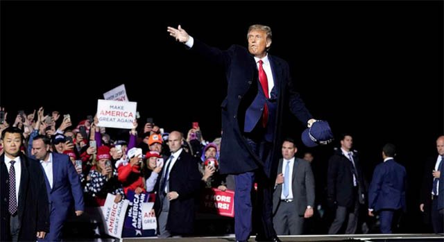 President-elect Donald Trump waves at an election night watch party at the Palm Beach Convention Center, in West Palm Beach, Florida, Nov. 6, 2024.