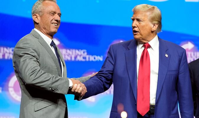 Republican presidential nominee former President Donald Trump shakes hands with Robert F. Kennedy Jr (Image: AP)