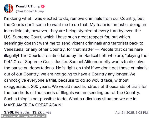 Earlier this week, the president issued yet another warning to judges who have issued rulings that would curb his aggressive migrant deportation plans, arguing that 'you can't have a trial for all these people'.