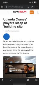 This is not the first time the Cranes have been taken to Crane’s Paradise Hotel. In November 2020, New Vision reported that the players were lodged at the facility while it was still under construction. The paper ran a stinging headline: “Uganda Cranes’ players sleep at ‘building site’.” Journalists who visited the camp then found workers fixing windows in rooms occupied by players and builders on the extension wing of the hotel.