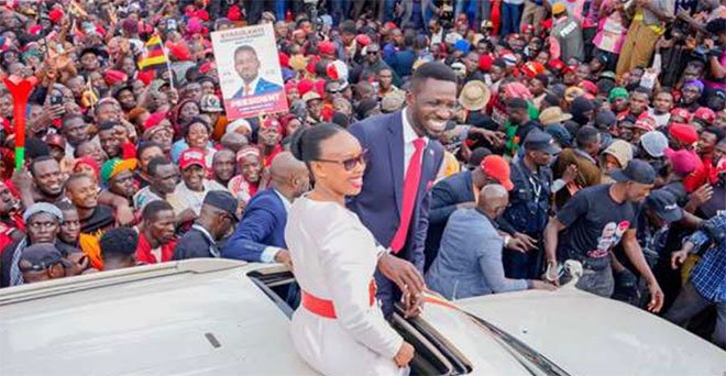Soon after, the couple drove off southwards in a loud convoy of cars carrying supporters and party officials to Lweza off Entebbe Road which was the gazetted nomination grounds by the Electoral Commission venue. All along the way, Kyagulanyi aka Bobi Wine kept waving to cheering supporters along the road.